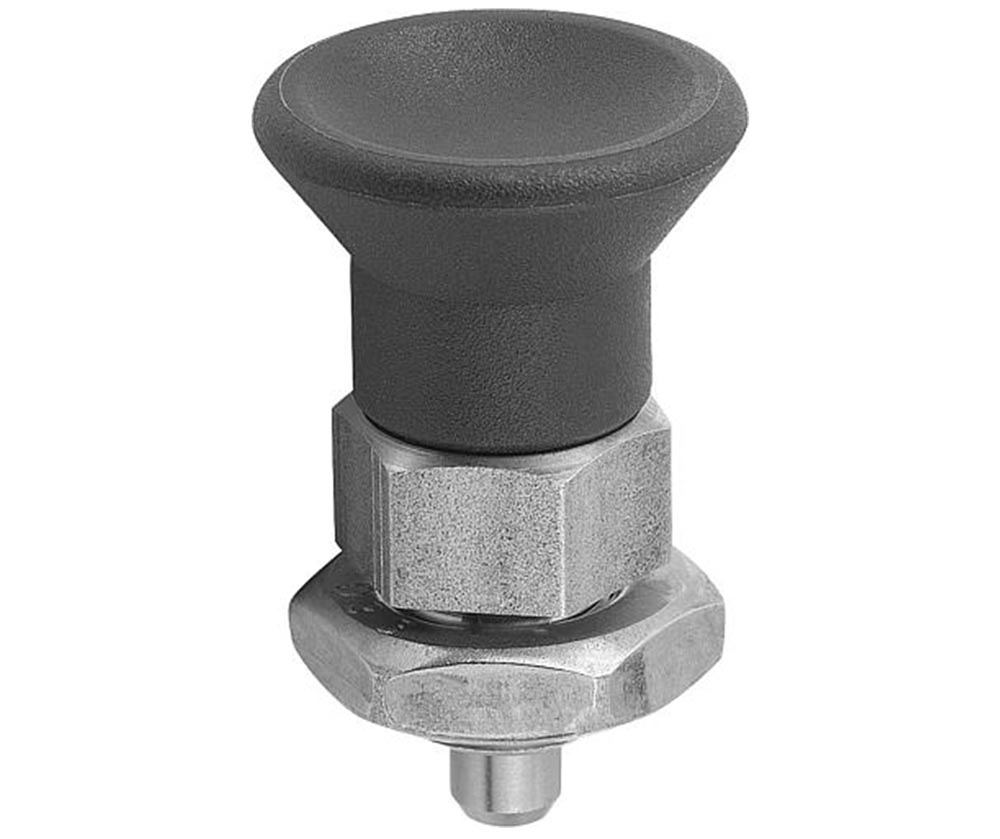 These spring loaded hand retractable plungers are used to prevent any change in locking position due to lateral force. Pulling up on the handle retracts the plunger pin into the body. The short body allows the plungers to be used in confined spaces. The body is made from stainless steel with a natural finish. The knob is made from black plastic. Plungers are supplied with a jam nut. Plungers without jam nuts are also available.