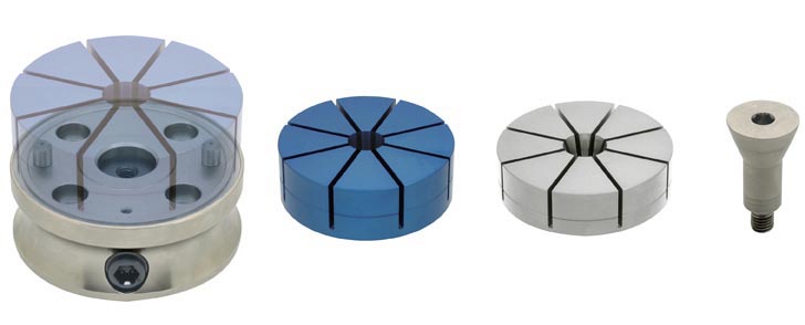 When the locking screw is tightened, the central bottom part of the jaw is pulled down. At the same time the four jaw sections tilt toward the center to clamp the circumference of a part.