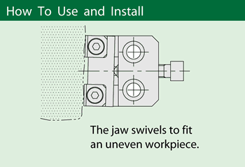 The jaws move forward and downward as the ball screw is tightened. The jaws swivel 1.5 degrees from center to allow for clamping on uneven surfaces. Tightening the ball screw forces the clamp forward and downward against the workpiece supports and stops. The body is made from 1045 alloy steel. The arm is made from 1045 alloy steel and heat treated. The replaceable jaws are serrated for positive holding and are made from M-2 high speed steel, hardened to Rc 60/62. Parts have black oxide finish.