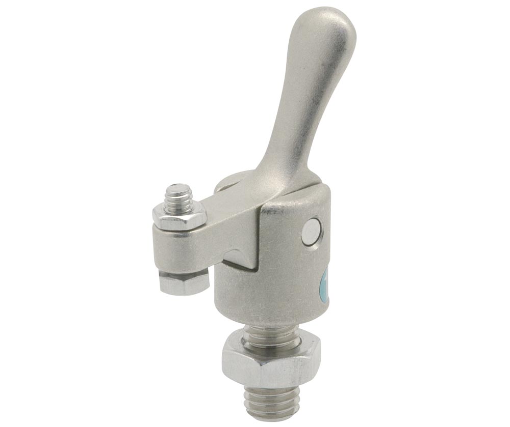 These snap clamps use a unique snap-on system to provide uniform and positive clamping in one smooth operation. As the handle is moved upward, the internal mechanism works to build tension. At a specified point, the tension is released and transformed into clamping force. This allows uniform clamping force with every cycle. The one piece body offers excellent durability and will not become weak or unstable after repeated use like traditional toggle clamps. They are ideal for small part clamping and where space is limited. They are designed for fingertip handle operation. Urethane tip style spindles are available. The body and clamping arm made from 300 stainless steel. The stainless provides corrosion resistance in hostile environments. The stated clamping forces and handle operating loads can vary by +/-20%.When the reaction force exceeds the stated clamping force, the clamp will release.